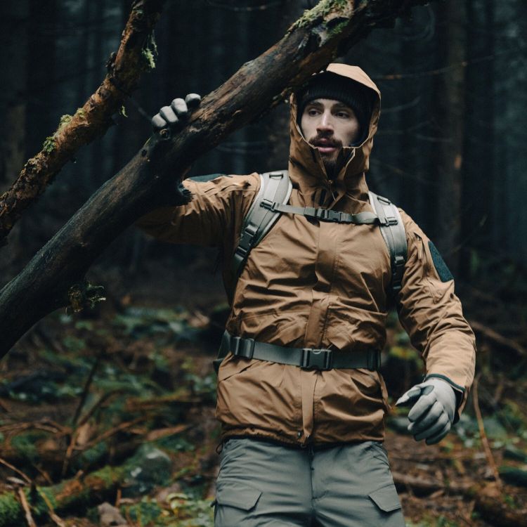 With a weight of approximately 400 g (size L), the Chinook Jacket is designed as a lightweight protective outer layer for hiking, shooting range use, bushcraft, and everyday outdoor activities in wet conditions from approximately -5 °C to +10 °C.
