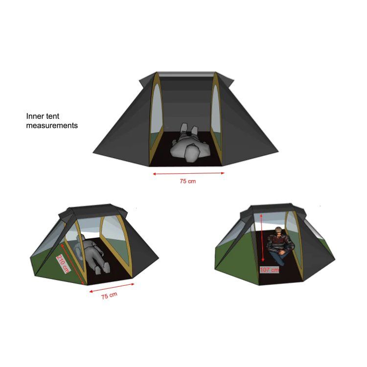 - Sisäteltta: sopii 190 × 65 cm makuualustalle + varusteille
