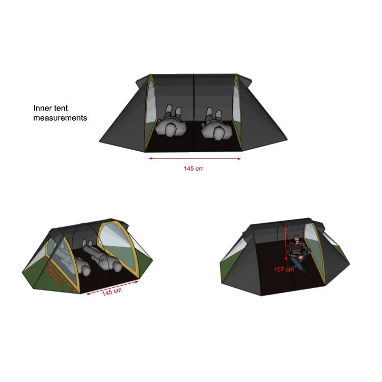 - Sisäteltta: sopii 2 × 190 × 65 cm makuualustalle (+ lapsi/varusteet)
