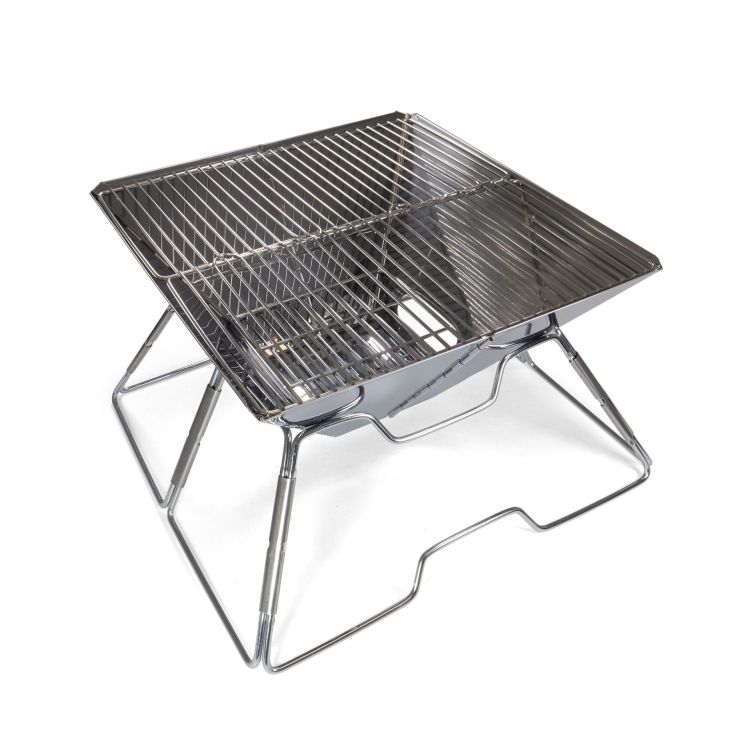 Origin Outdoors Tetragon on kompakti mutta monikäyttöinen retkigrilli, joka toimii samalla myös tulimaljana. Neliönmuotoinen rakenne tarjoaa yllättävän suuren grillausalan kokoonsa nähden, ja koko grilli taittuu litteäksi kuljetusta varten.
